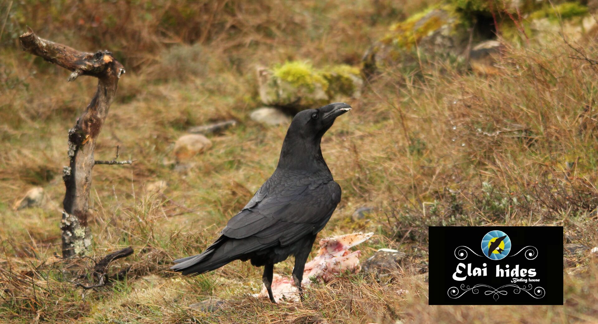 Ya he llegado al aguardo y comienza la espera. A la media hora se escuchan a lo lejos los graznidos destemplados de una pareja de cuervos (Corvux corax). Se acercan. Los silbidos de sus alas me rodean y no paran de meter ruido volando sobre mi posición. Todo el monte sabe ya que aquí hay comida.