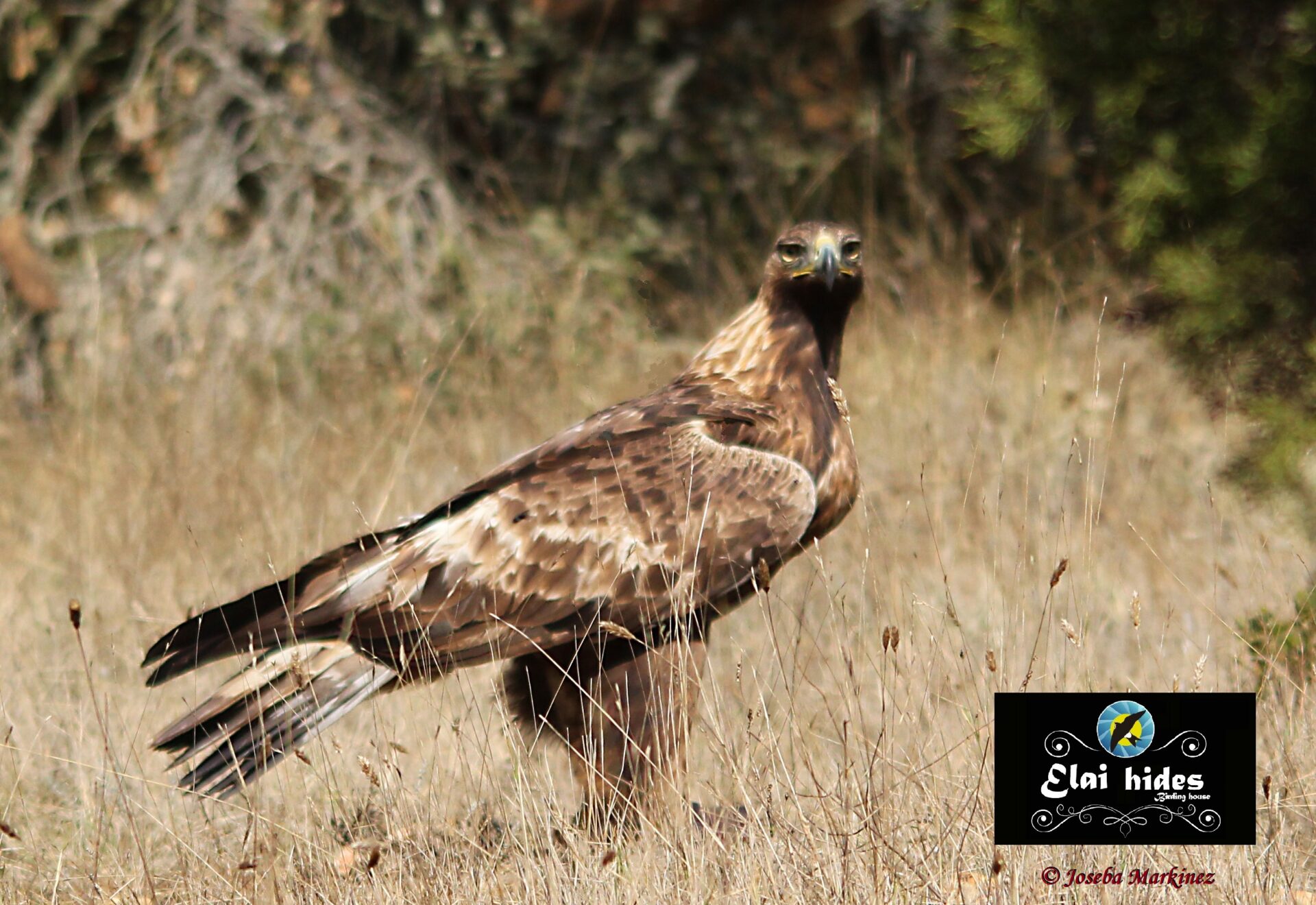 De repente escucho un rumor repentino como si fuera viento recio soplando sobre las copas de los árboles, pero las copas de las encinas no se mueven. El viento está en completa calma. Al rumor de aire le sigue un “choque” de algo contra las ramas. Un ave de gran tamaño se acaba de posar en un pino silvestre de mucho porte situado a pocos metros detrás de mi. Los segundos parecen horas. De repente unos gritos agudos y repetitivos me confirman que lo que está sobre mí es el águila real. Segundos más tarde la rapaz baja a tierra y andando parsimoniosamente se acerca a la carne. Por el camino se detiene apenas un instante y me clava sus pupilas amarillas. Pulso el disparador apenas una vez. El resultado no es óptimo, quizás los nervios, quizás la emoción del momento que no me dejaba pensar con claridad.