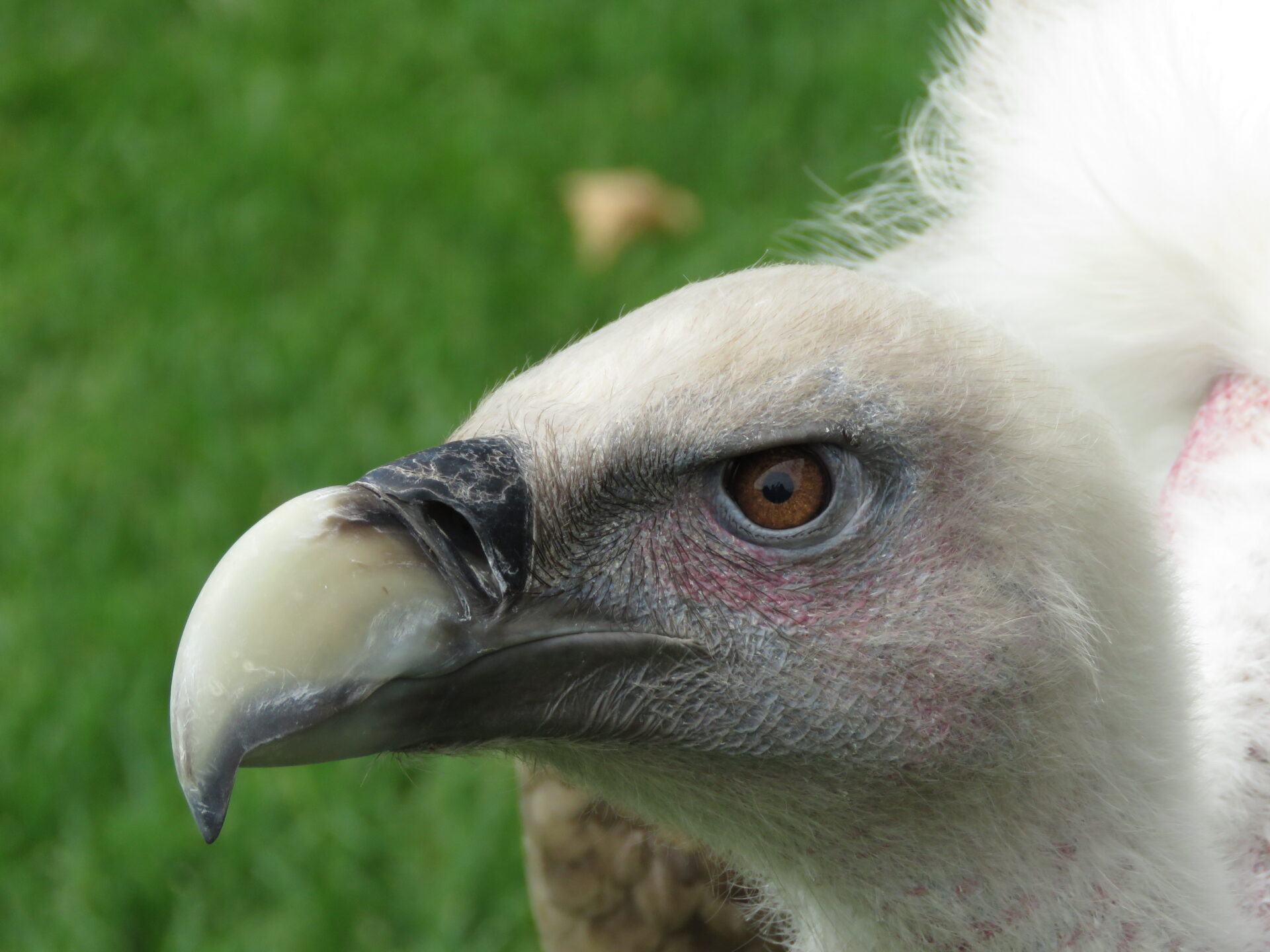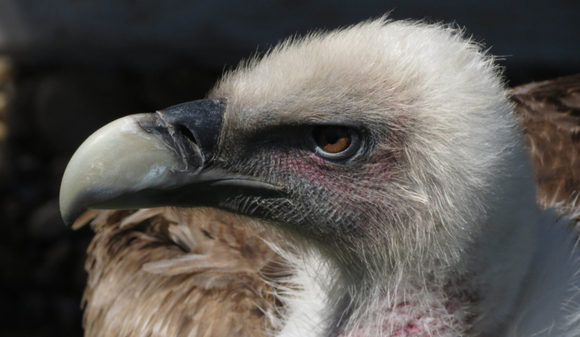 Los adultos, por el contrario tienen el pico color hueso claro y el iris de sus ojos es de un claro y bonito tono ambarino. Las plumas de la gorguera pierden su forma lanceolada y pasan a ser una especie de plumón apretado de color claro, prácticamente blanco. Éstas plumas que rodean sus desnudos cuellos tienen una función fundamental para mantener su temperatura corporal cuando planean inmóviles a grandes alturas con temperaturas gélidas y fuertes vientos.