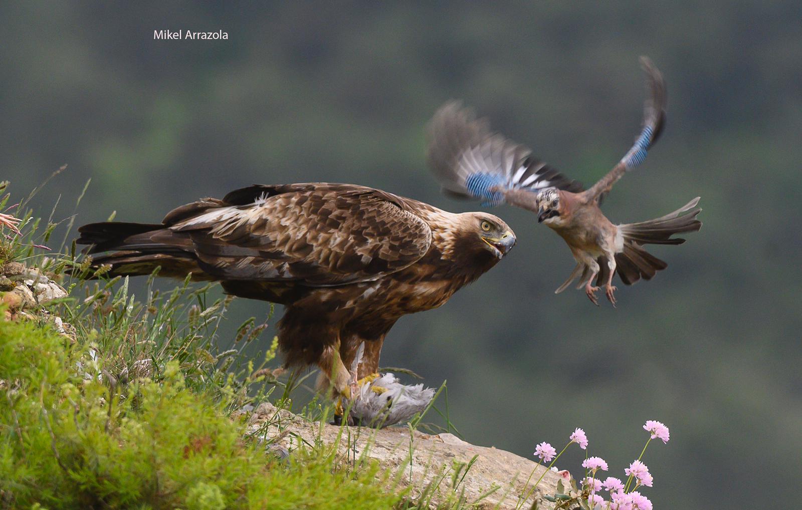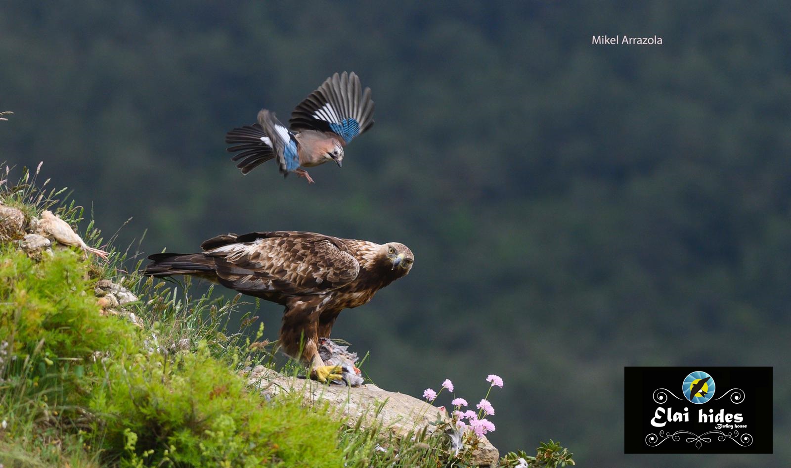 El nombre latino de su género es Garrulus, que significa gritón o charlatán. Es tan hábil con su voz, que es capaz de imitar con inquietante perfección los gritos del águila real en el hide “Saitoki” y los gritos del busardo ratonero en el hide “Urbigain”. Pero ésto no es todo. Lo mejor es que imita al águila para auyentar a otros posibles depredadores como azores o gavilanes. Sabe perfectamente que las águilas comiendo en ese punto del barranco es un seguro de vida para ellos y con las águilas están más tranquilos y confiados. Solamente hay unos dias de primavera en los que su actitud hacia las águilas se torna tremendamente agresiva, y creemos que coincide con el momento en que sus pollos se desarrollan y emancipan. Entonces, y sólo entonces, el águila pasa de ser aliada a enemiga.