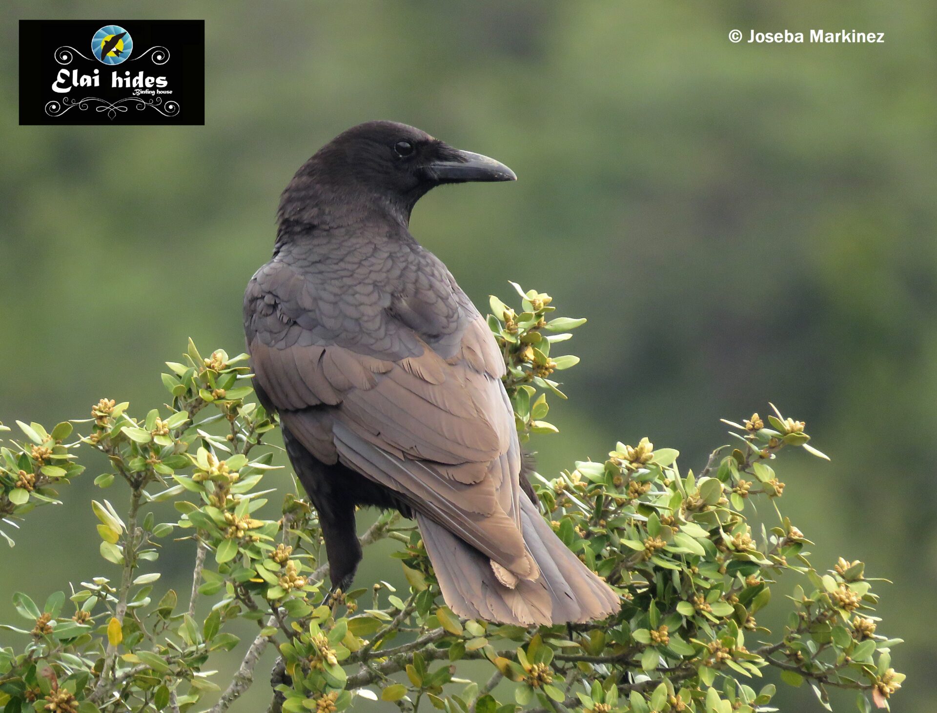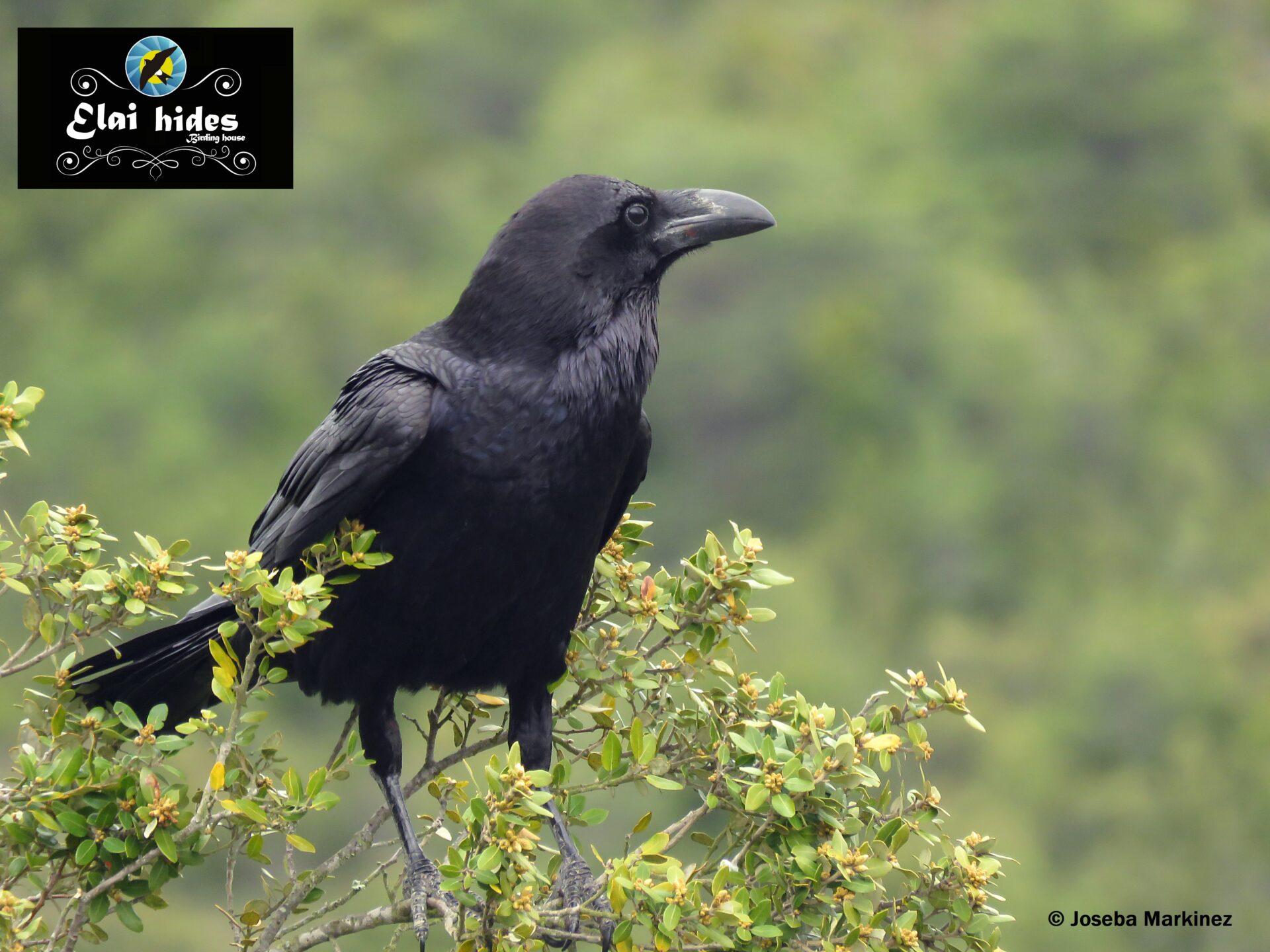 Los siguientes comensales en llegar son también córvidos, pero ambos de tornasolados y brillantes tonos negros. La primera fue la corneja negra (Corvus corone), siempre inquieta y desconfiada, revolotea por los alrededores del hide llamando la atención de todo el mundo.