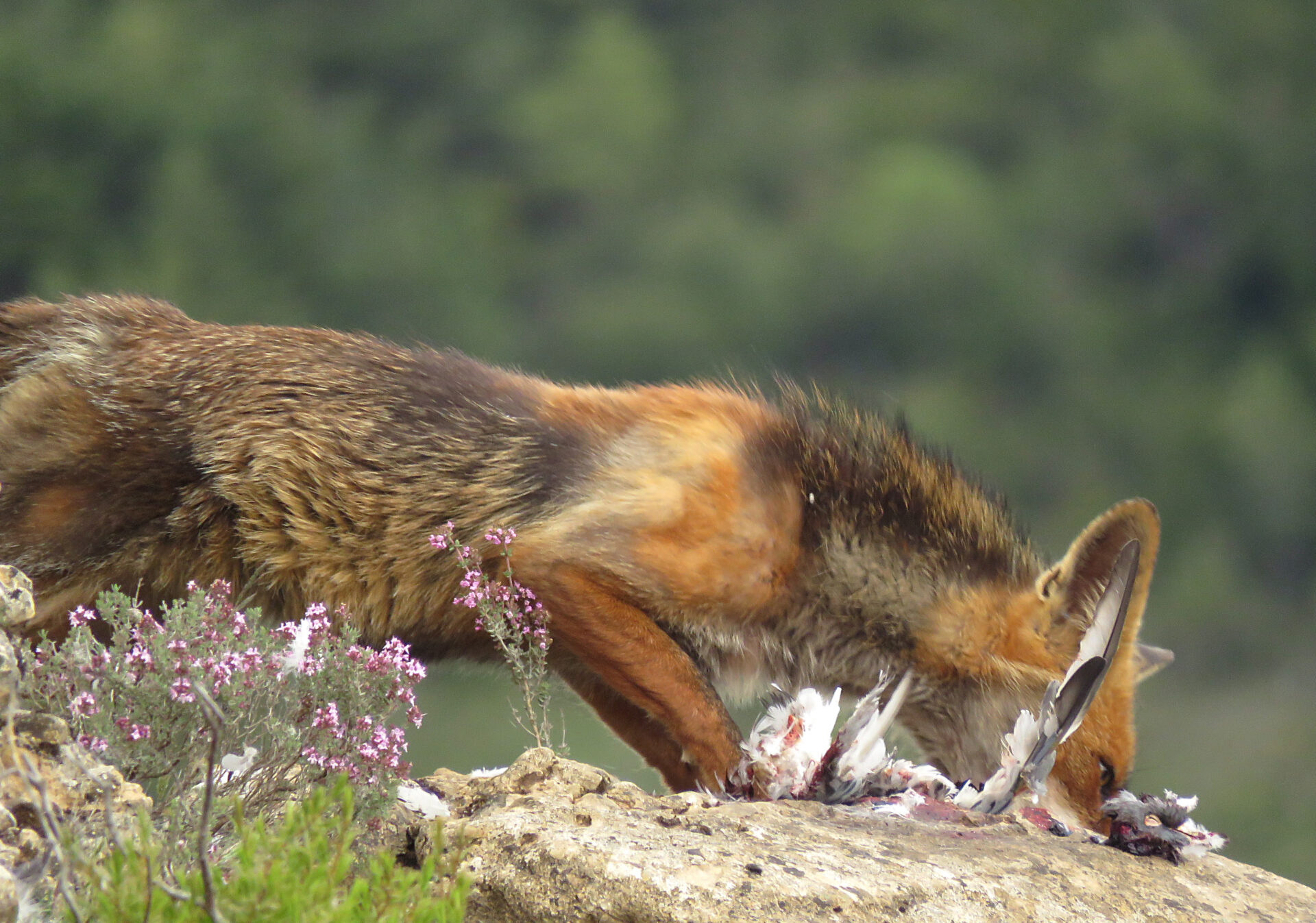 Cuando nuestras protagonistas saciaron su hambre y la hembra llevó un buen trozo de paloma a su inaccesible nido, todo quedó en calma…o al menos eso creía yo cuando me puse a revisar los numerosísimos archivos captados en la sesión en la pantalla de mi cámara. Pero en el hide la calma solo era aparente. De repente un enorme y rubio raposo llegó al posadero a rebañar los restos del banquete real.